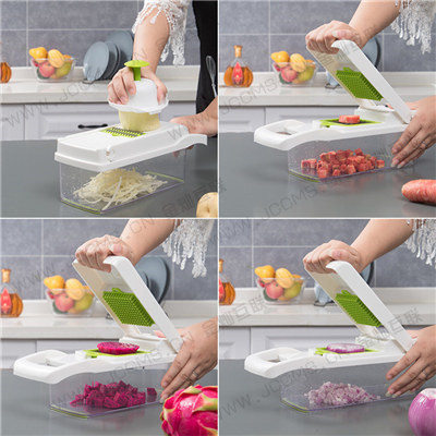 2. PRODUCT DESIGN:There is a non-slip rubber strip at the bottom to absorb the ground, firmly absorb the ground to maintain stability, large capacity space, convenient storage and cleaning, all the blades can be stored when the volume space is not in use, to avoid loss and confusion, the blade is made of stainless Material can be used for cutting, slicing, slicing and chopping fruits and vegetables, such as onions, mushrooms, cucumbers, carrots, potatoes, tomatoes, ginger, garlic, cheese, etc.