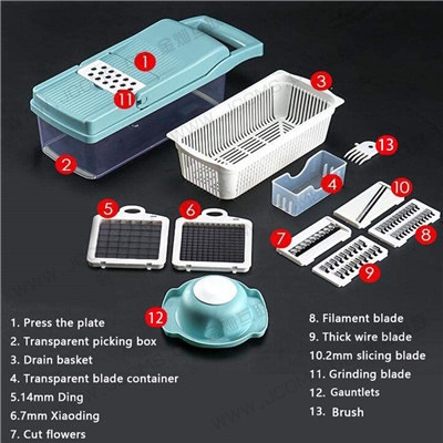 1. 13 IN 1 VEGETABLE AND FRUIT CHOPPER:Multi-function vegetable and fruit chopper contains 12 components, including 7 interchangeable stainless steel blades, 1 pressure plate, 1 food pickup box, 1 drain basket, 1 storage The blade container, a protective hand pad, can be cut into large or small pieces, thick or thin slices, cut into large and small filaments, spiral or ribbon.
